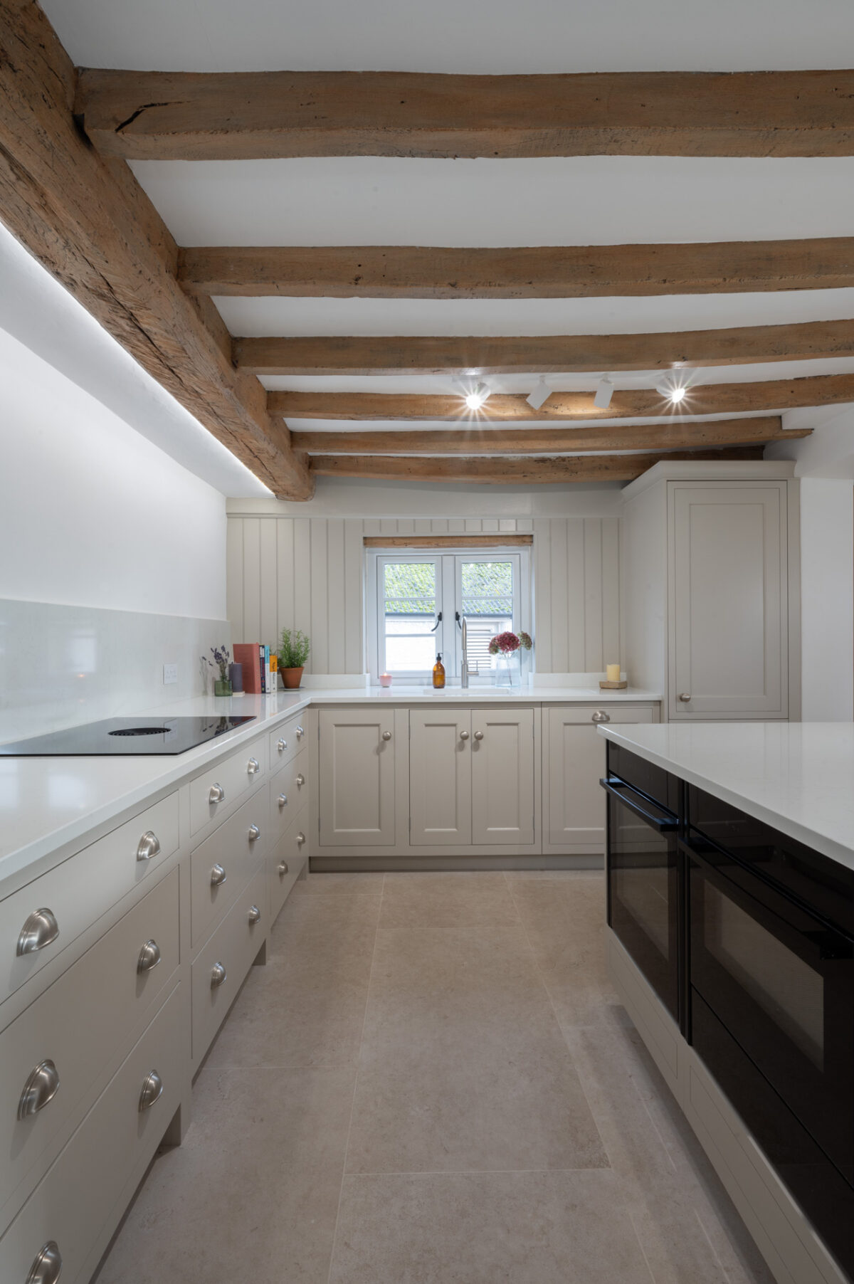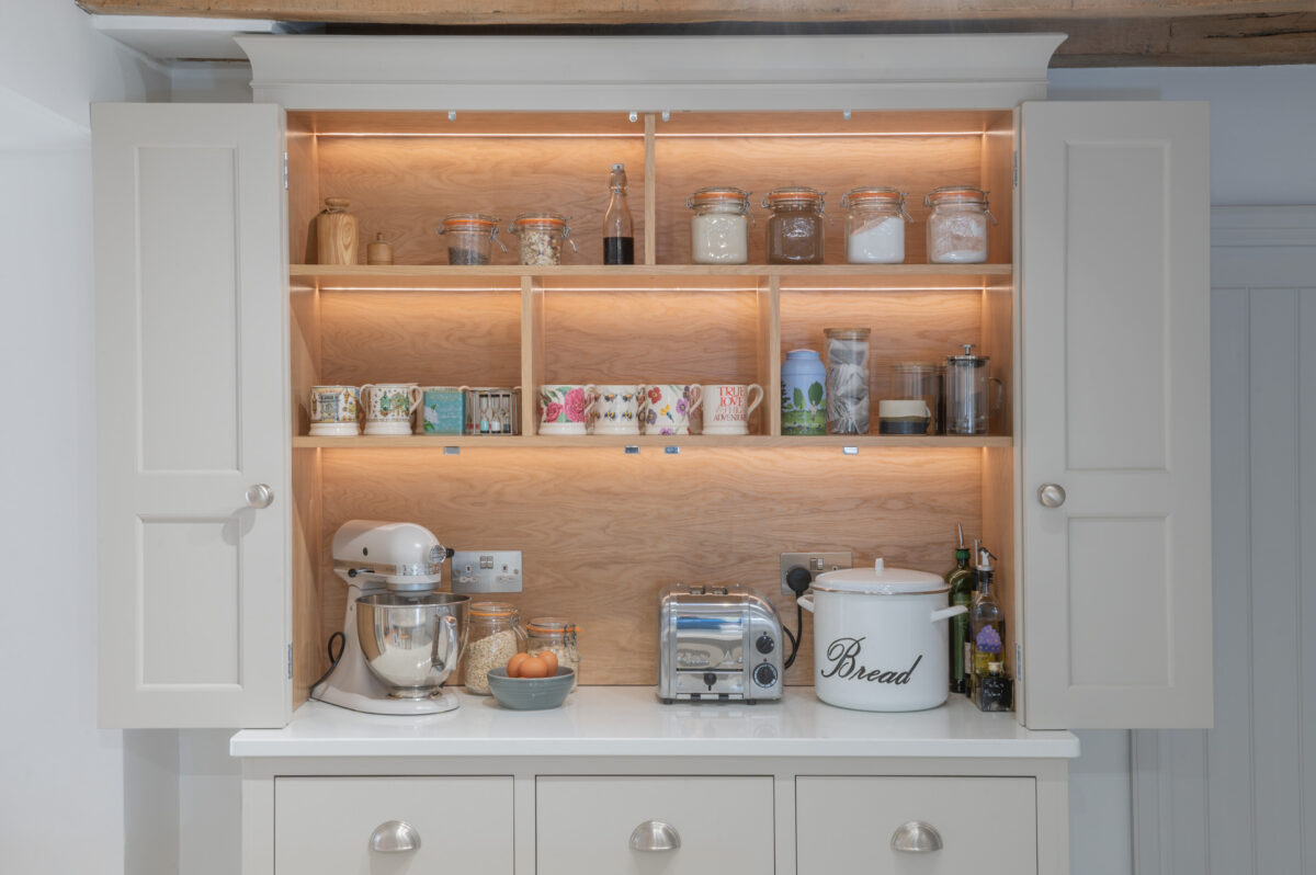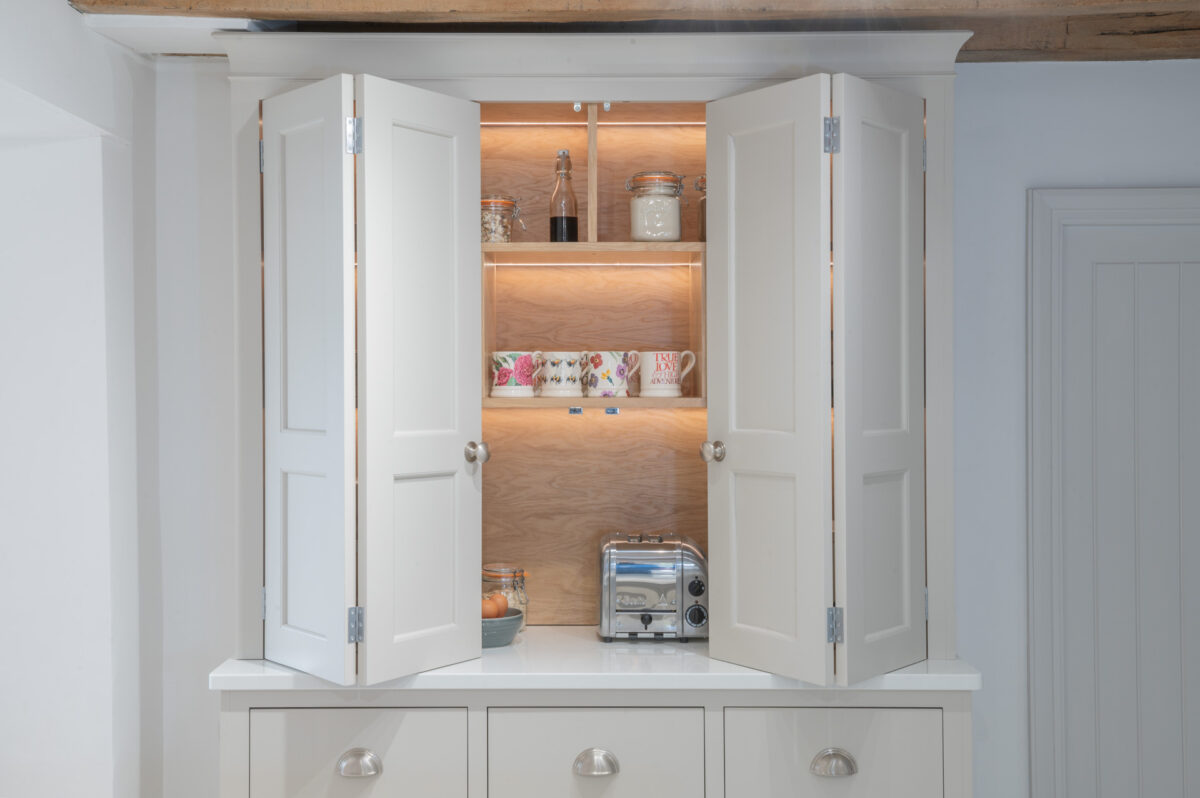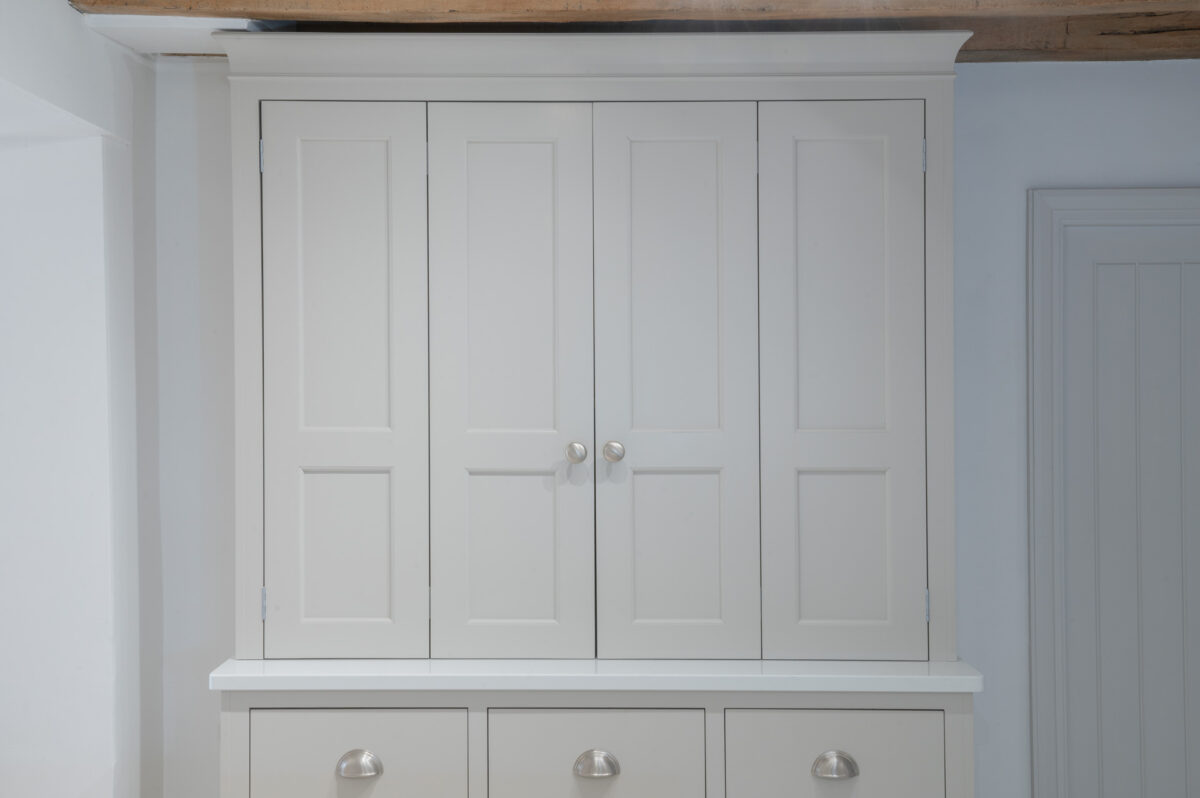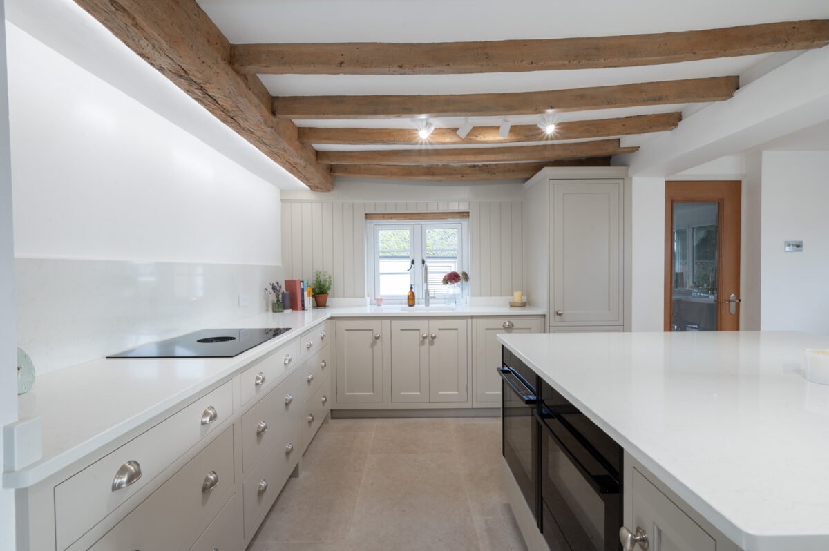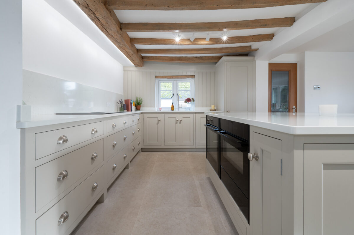 Throughout the design, the cabinetry was carefully adapted to work around the cottage’s original features. Beams, walls and proportions guided the detailing, with subtle adjustments made during manufacture to ensure everything sat comfortably within the character of the building rather than competing with it.