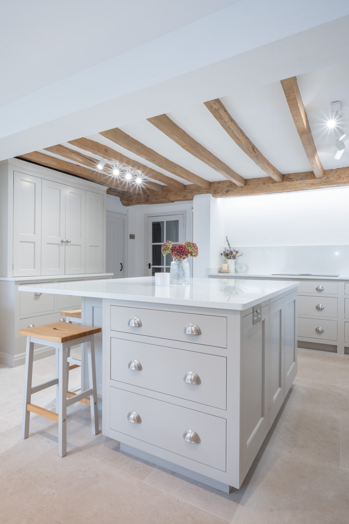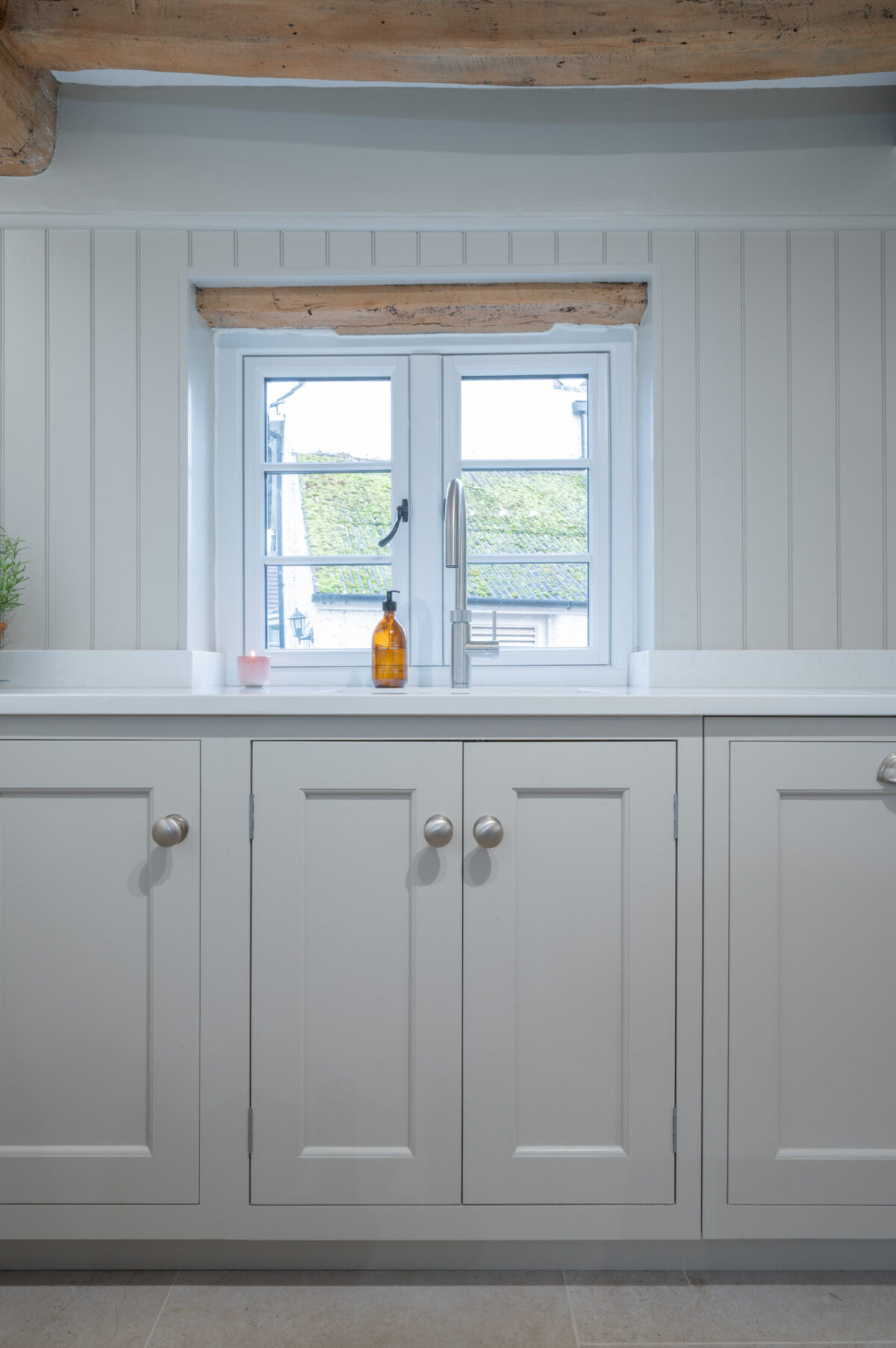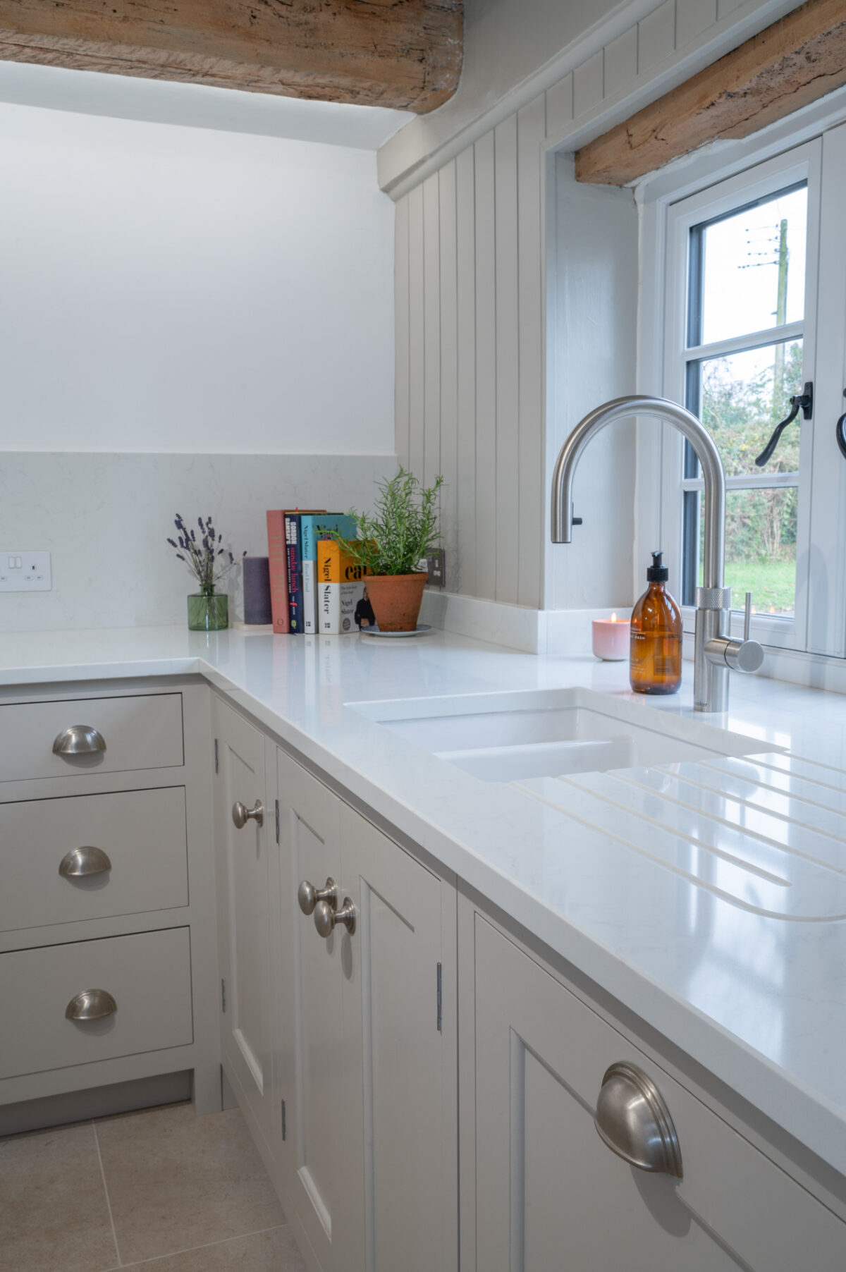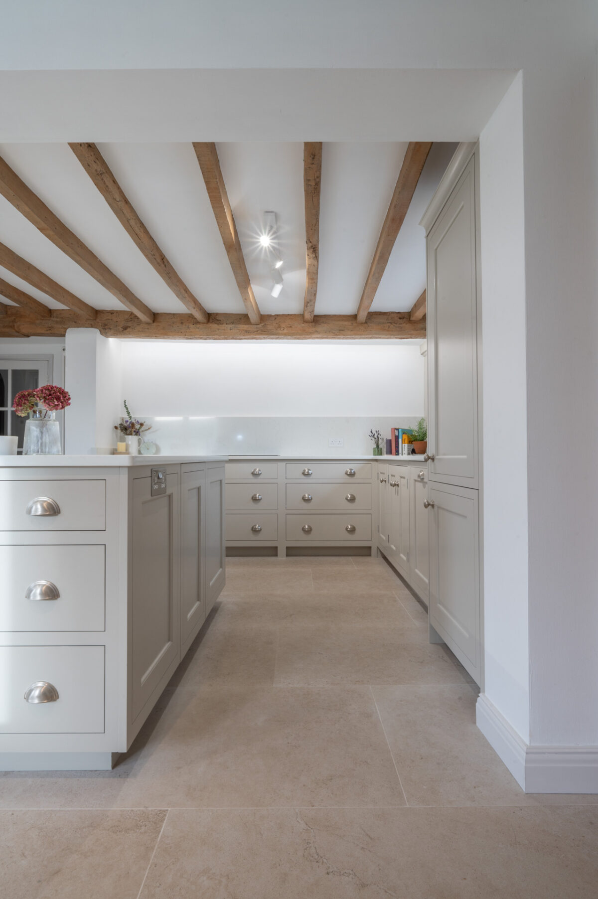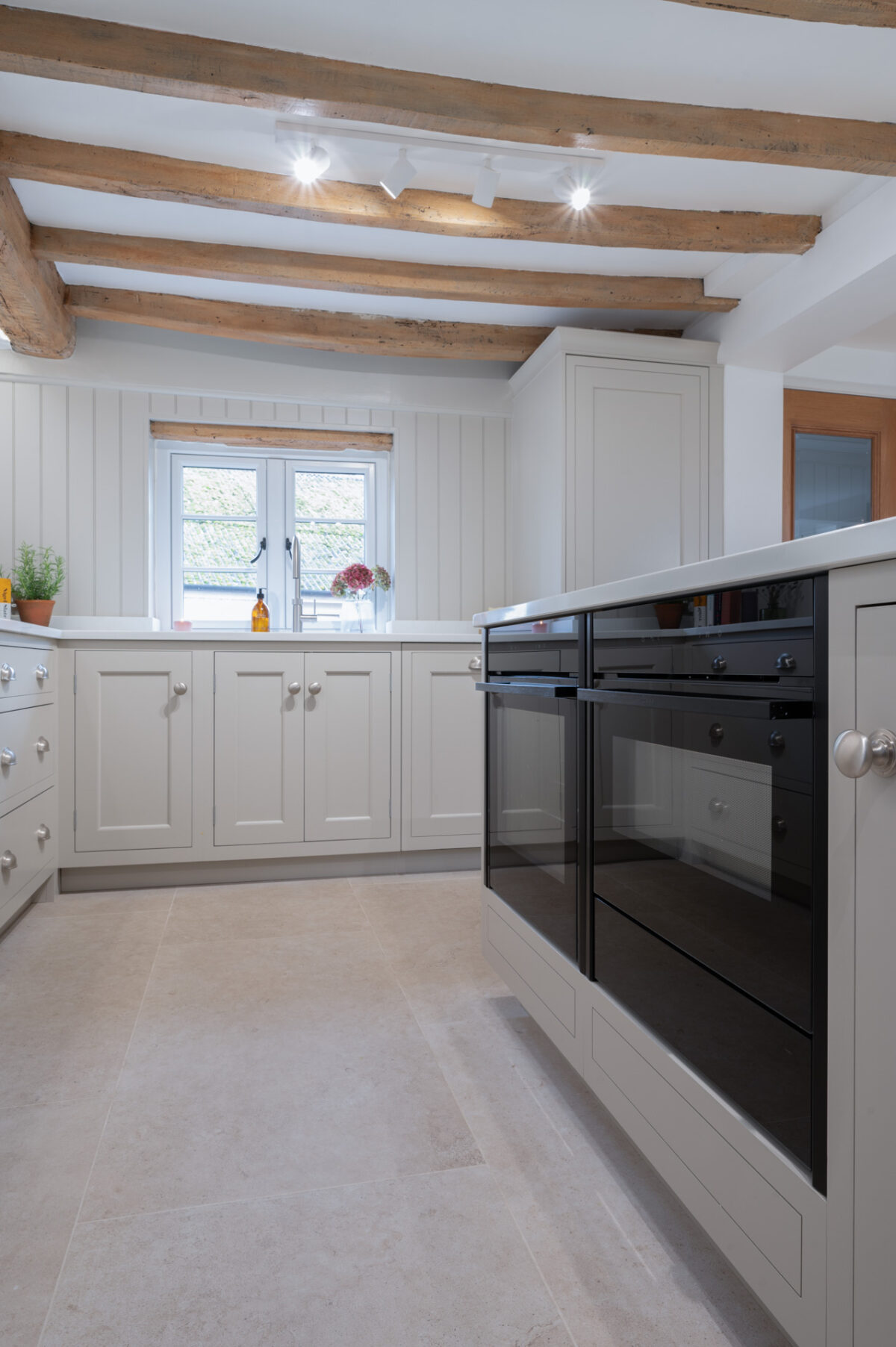 Throughout the design, the cabinetry was carefully adapted to work around the cottage’s original features. Beams, walls and proportions guided the detailing, with subtle adjustments made during manufacture to ensure everything sat comfortably within the character of the building rather than competing with it.