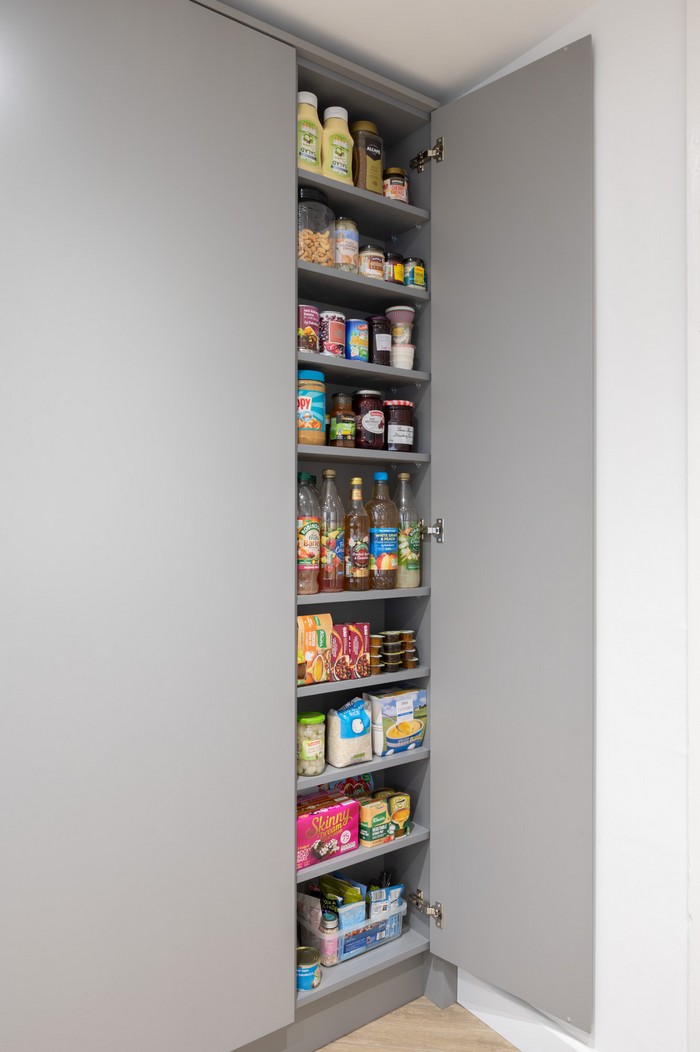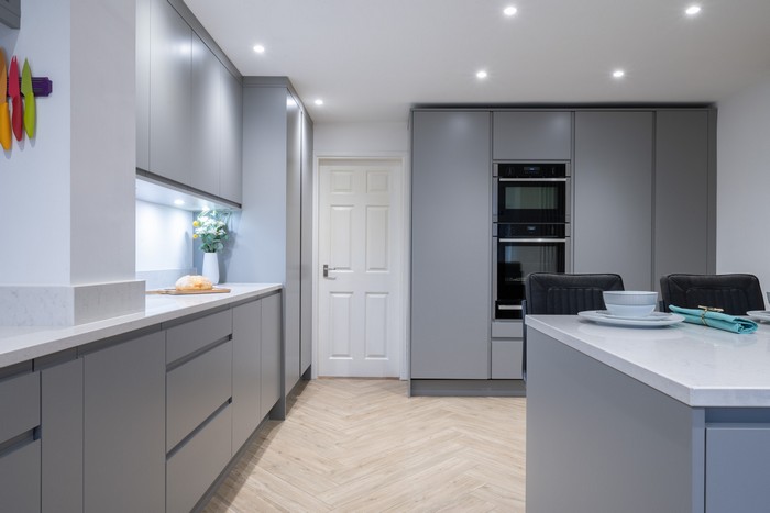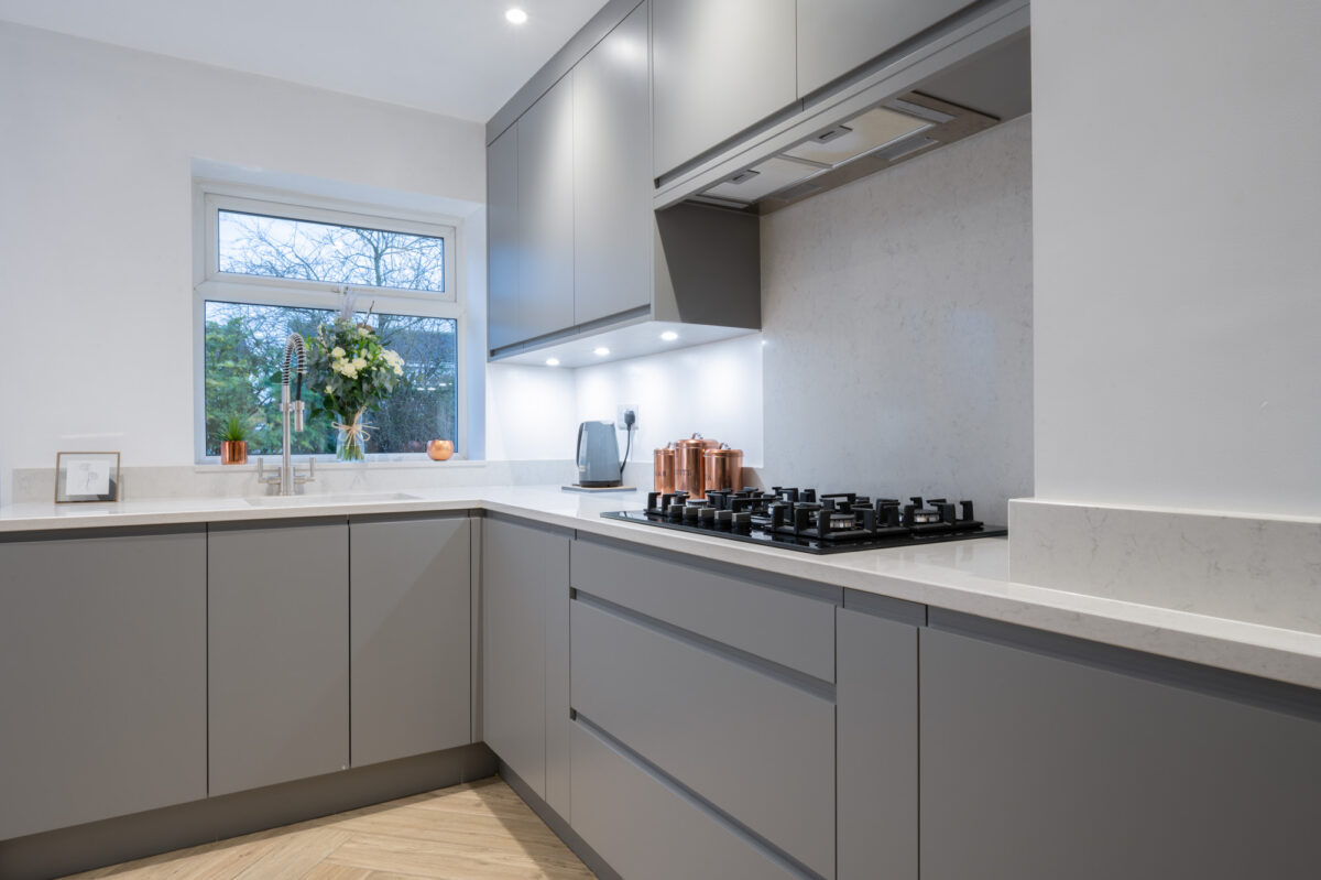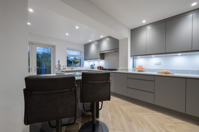 The addition of wide patio doors at the rear introduced natural light into the space, creating a seamless connection between the kitchen and garden. What was once fragmented and impractical is now light-filled, welcoming and designed for everyday living.