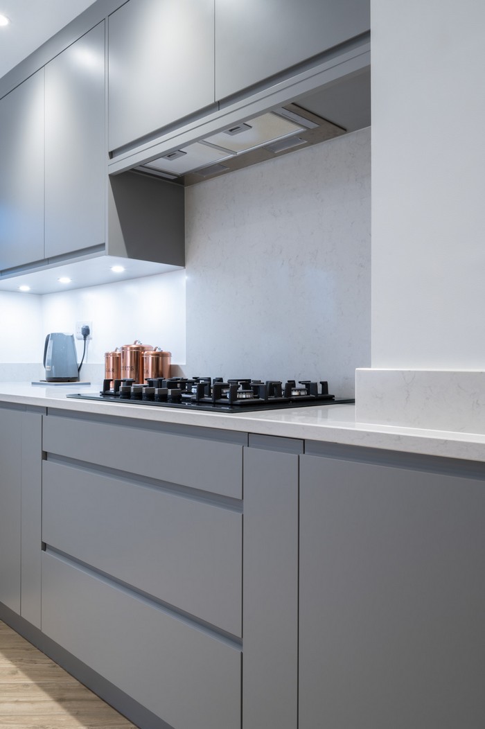 Colour and lighting were carefully considered to ensure the space felt bright yet grounded. Farrow & Ball’s Plummet was chosen for the doors, adding depth and character without overwhelming the room. Fresh white walls and under-cabinet lighting balance the darker tones, ensuring the space remains open and airy throughout the day and into the evening.