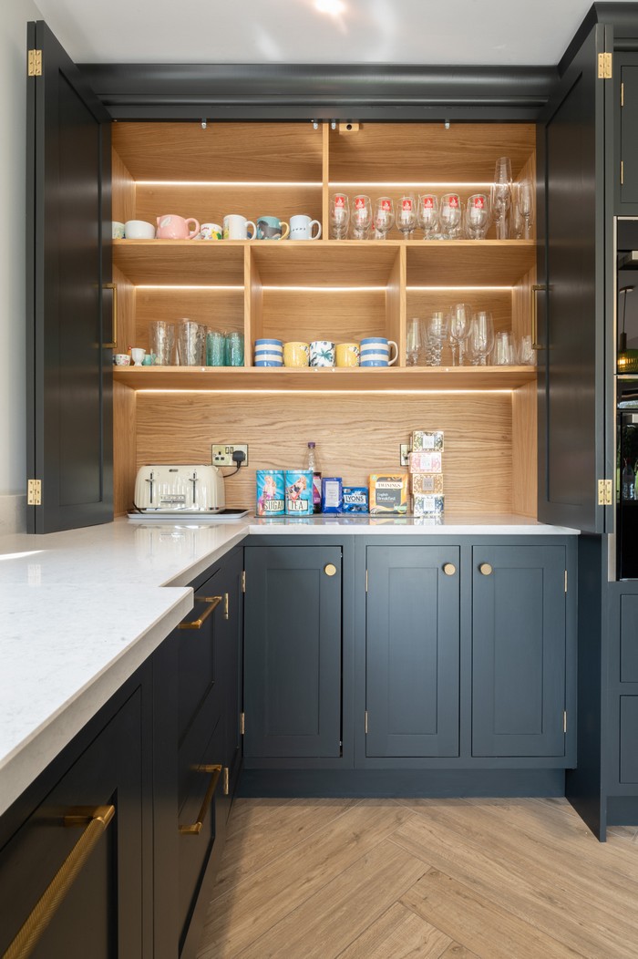 Open-plan living brings with it its own set of challenges, and without clear definition, large spaces can easily feel underused or lacking purpose. In this design, zoning was key. A recess between two walls provided the ideal location for a dedicated bar area, allowing drinks to be served away from the main food preparation zone and creating a natural hub for entertaining. Opposite the bar, a separate side room was perfectly proportioned to become a butler’s pantry, offering generous additional storage for beverages and glassware while keeping the main kitchen clutter-free.