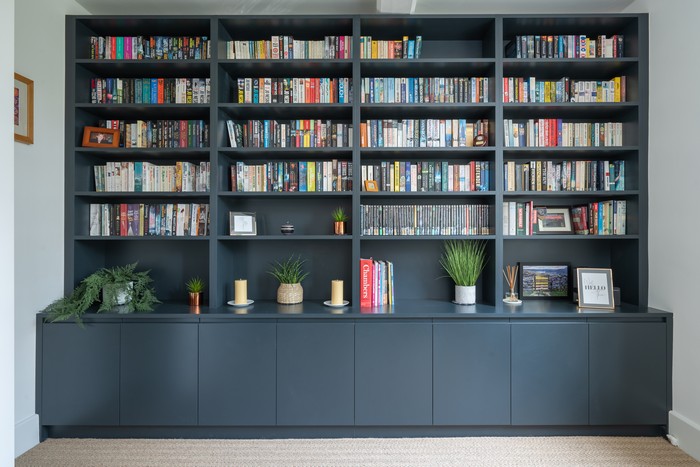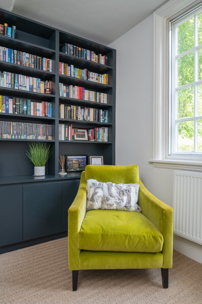 Elsewhere in the house, the study was redesigned for our client to work from home. The arrangement of cupboards and open shelves creates versatile and easily accessible storage while still allowing plenty of space for an easy chair and desk area.