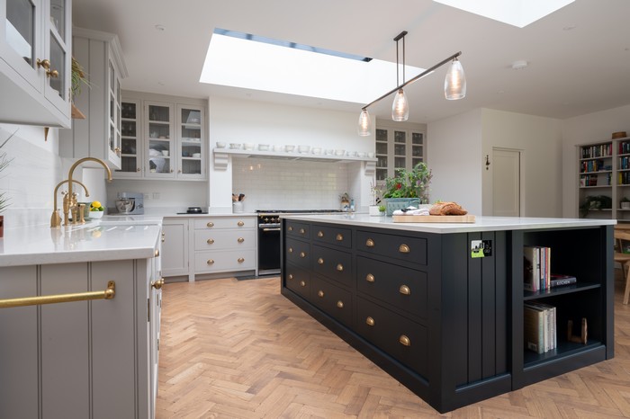 The room is large and open, incorporating dining and seating areas, which allowed us to introduce a substantial central island. Finished in Farrow & Ball Railings, it anchors the space and creates a natural social hub. The island features apothecary-style drawers at the rear - practical, highly accessible and ideal for locating items quickly.