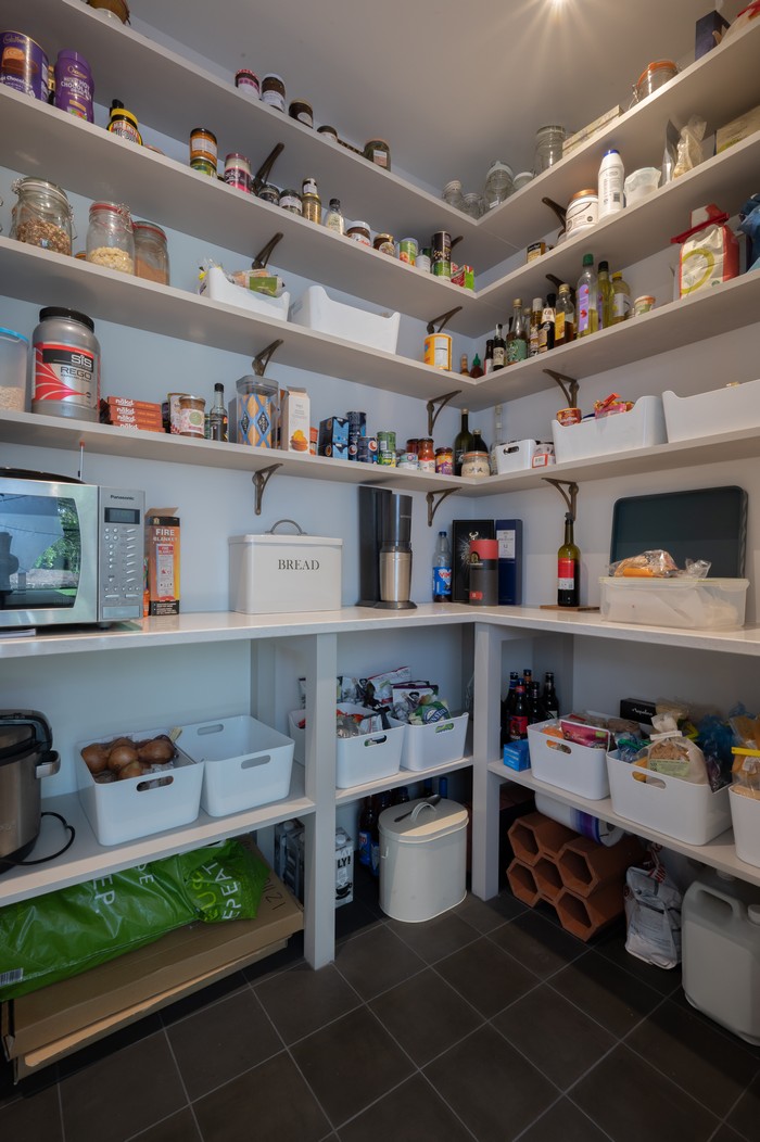 In the corner of the room, we designed and built a walk-in pantry with a sliding pocket door, allowing the everyday essentials to be tucked away neatly. When closed, it preserves the clean architectural lines of the room.